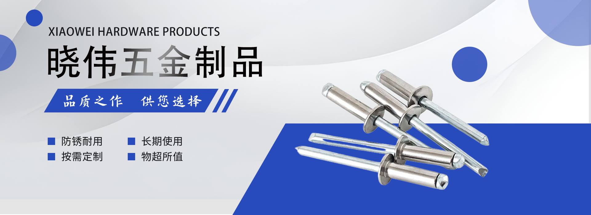 臨沂曉偉五金制品有限公司是一家擁有多年鉚釘制作經營的拉鉚釘廠家,主要經營產品有:拉鉚釘、抽芯鉚釘、異型鉚釘、拉花鉚釘。公司擁有先進的鉚釘生產設備及檢驗測試儀器,雄厚的技術力量保證產品的不斷更新,產品廣銷各地,被廣泛用于家具、家電、建筑裝潢、汽車制造、船舶制造、健身器材、通訊設備、電氣設備、集裝箱等領域。我廠所生產的產品質優價廉,發貨塊,服務周到,深得新老客戶的一致好評。“以人為本,開拓創新”是公司的發展動力。